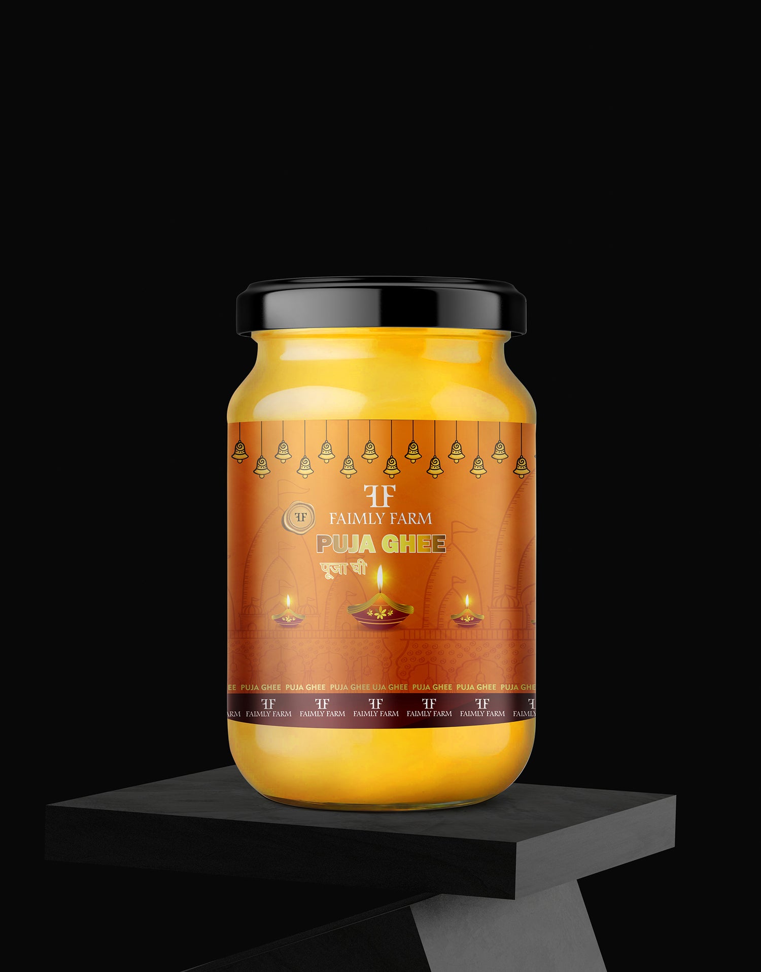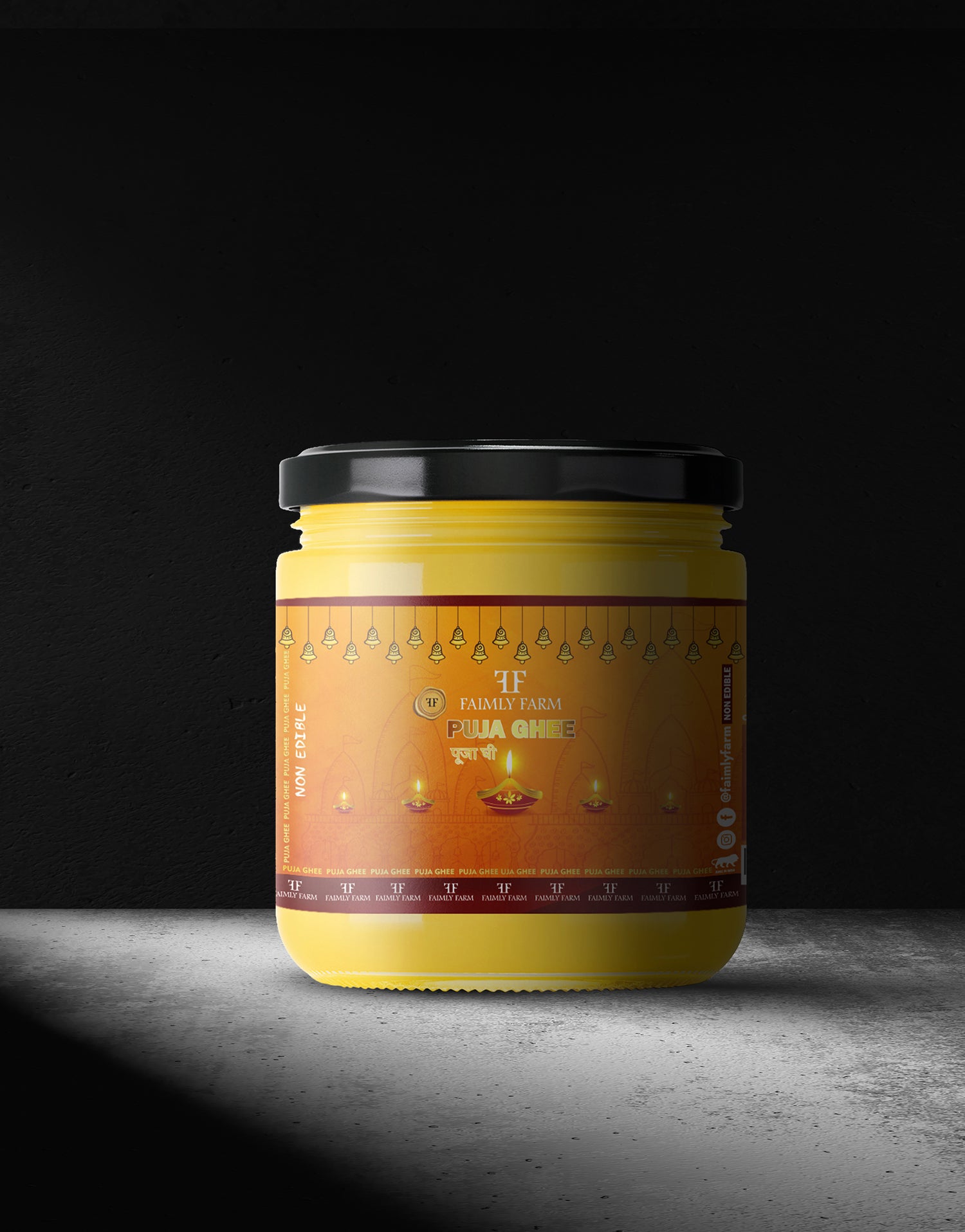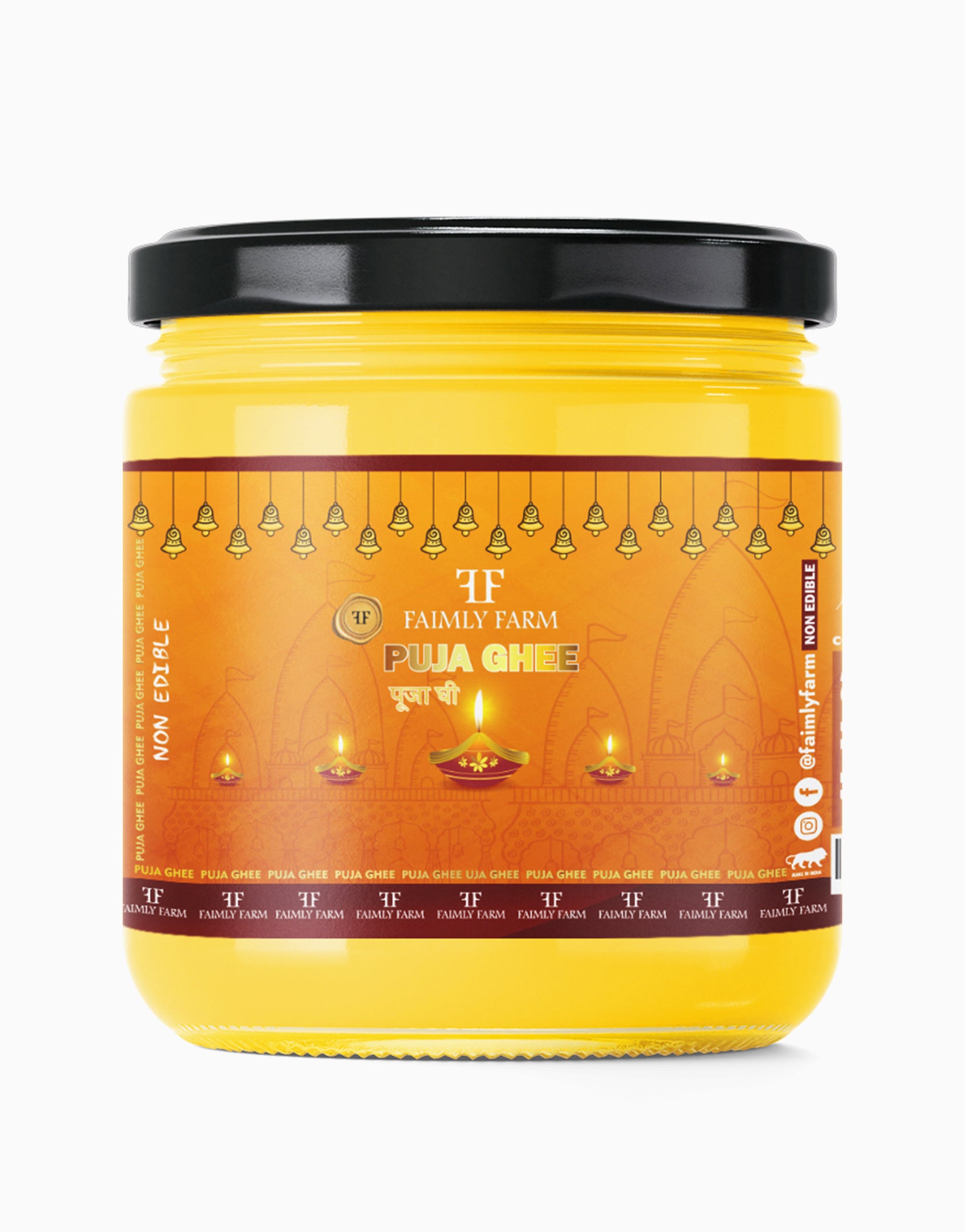 Faimly Farm Puja Ghee – Har Pooja Mein Shuddhata Ka Sparsh is a non-edible, pure cow-based clarified butter crafted exclusively for spiritual rituals and diya lighting. Specially designed to burn with a clean, steady, and long-lasting flame, this puja ghee ensures sanctity, purity, and a sacred ambiance for daily puja and religious ceremonies. Free from additives and ritually prepared, it delivers the true essence of shuddhata (purity) in every worship occasion, making it ideal for those seeking authentic ghee for spiritual use only.
