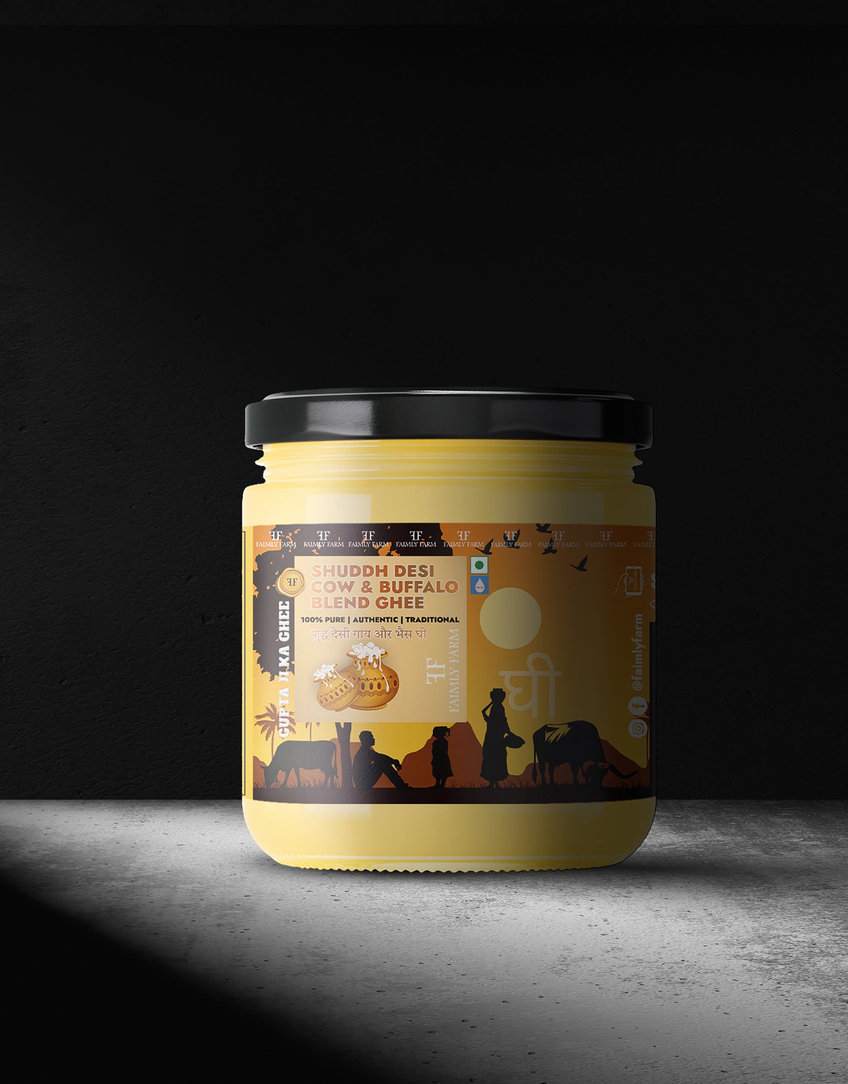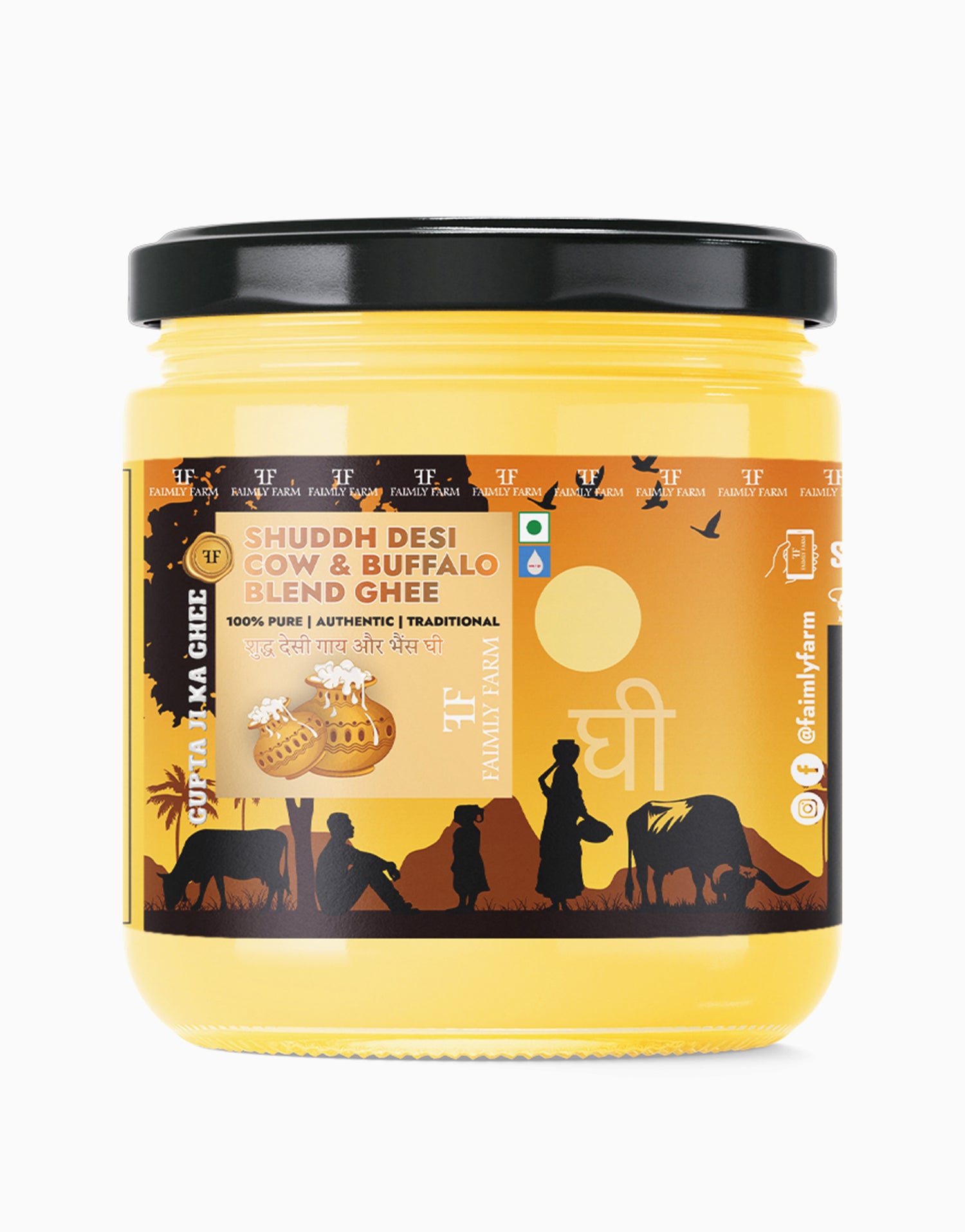 Shuddh Desi Cow & Buffalo Blend Ghee by Faimly Farm is a 100% pure, natural, and traditionally crafted blend of Indian cow and buffalo milk. Made with a slow-cooked desi process, it combines the lightness and aroma of cow ghee with the richness and creaminess of buffalo ghee for a perfectly balanced taste.