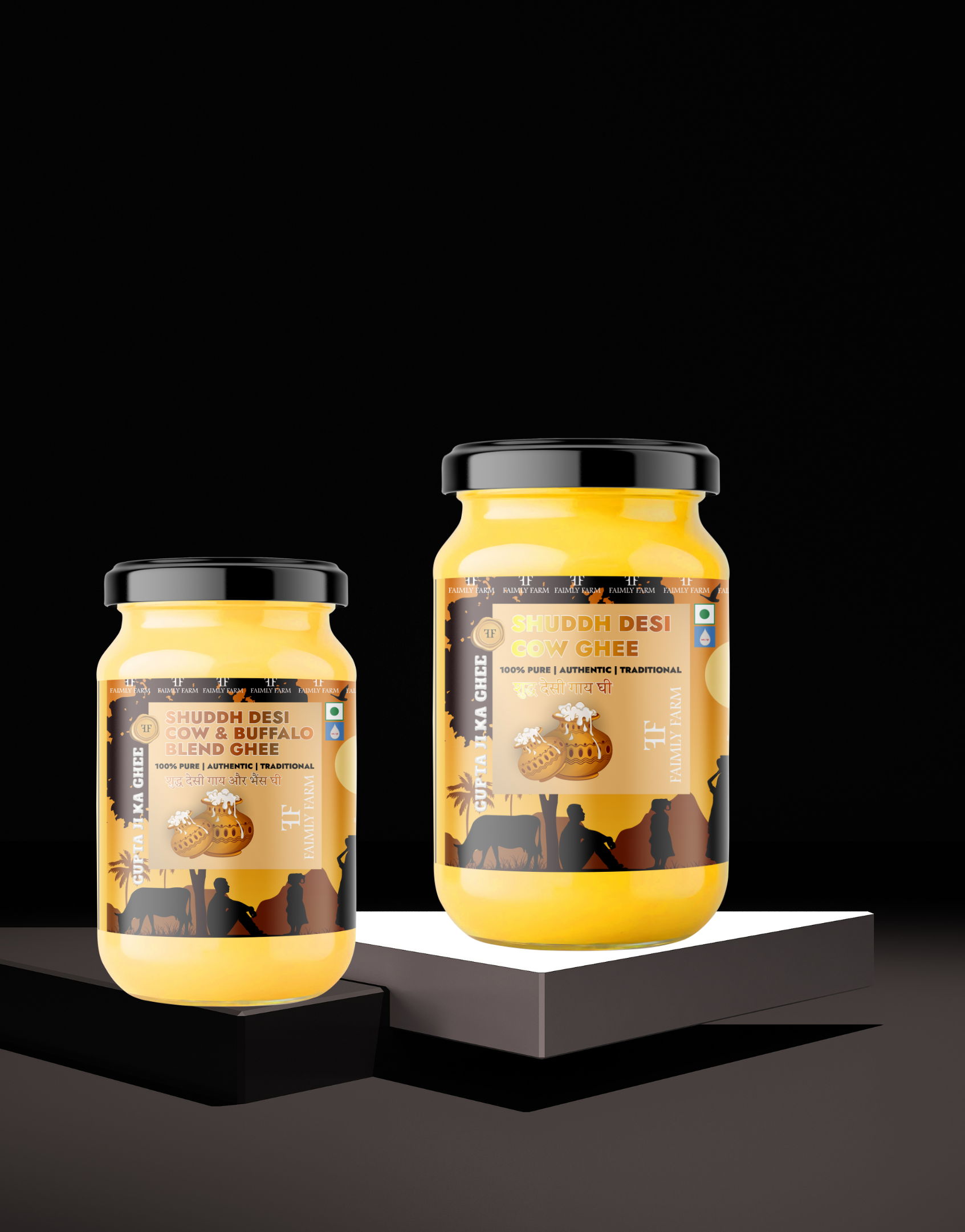 Shuddh Desi Cow Ghee Combo Pack from Faimly Farm is a 100% pure, authentic, and traditionally crafted ghee collection featuring cow ghee and cow & buffalo blend ghee. Made from forest-grazed desi milk, the ghee is curd-cultured, hand-churned, and slow-cooked using traditional methods to preserve its rich aroma, danedar texture, and nutrient-rich goodness.
