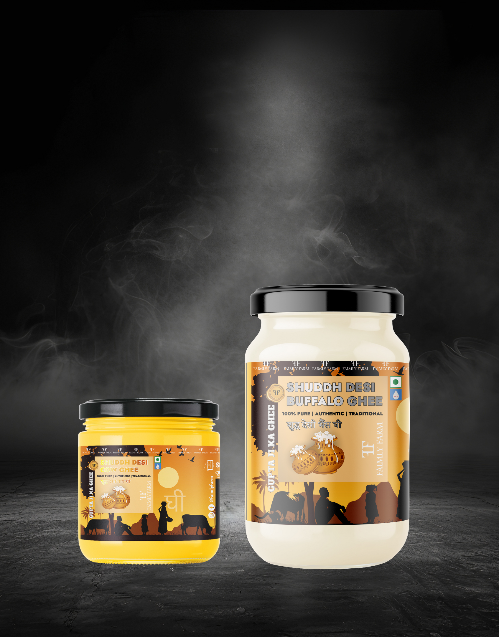 Shuddh Desi Cow Ghee Kitchen Duo Pack from Faimly Farm is a 100% pure, authentic, and traditionally crafted ghee collection featuring cow ghee and buffalo ghee. Prepared from forest-grazed desi milk, each batch is curd-cultured, hand-churned, and slow-cooked using time-honored methods to retain its rich aroma, danedar texture, and natural nutrients.